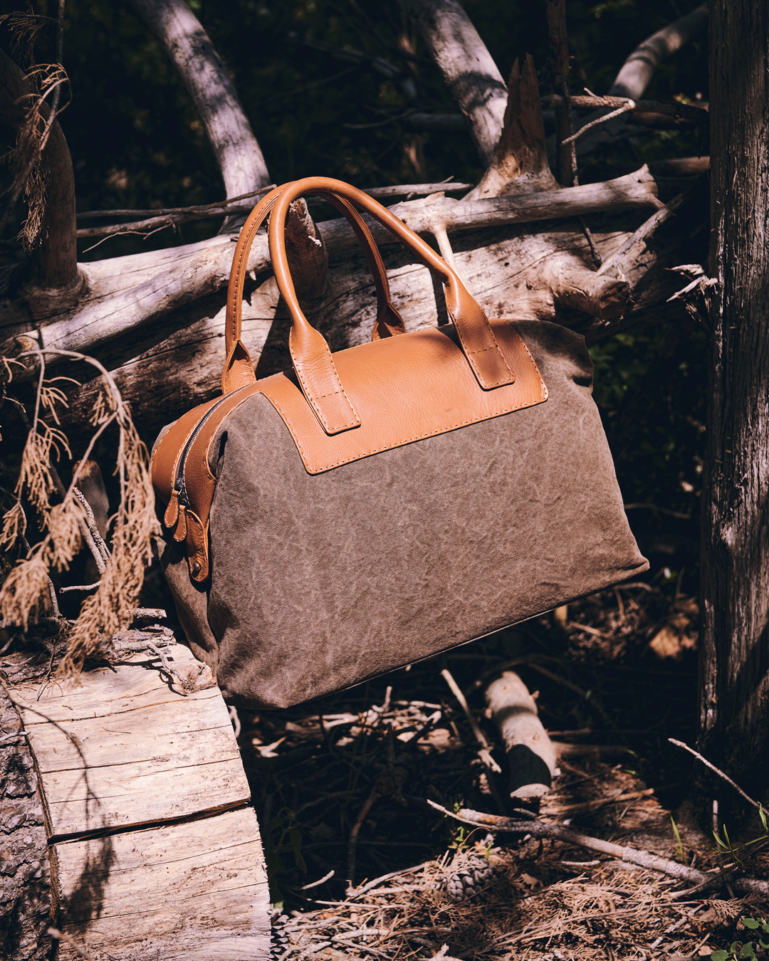BORSA VIAGGIO 48H CON TASCHE ESTERNE IN OLONA VERDE E VACCHETTA COLORE CUOIO